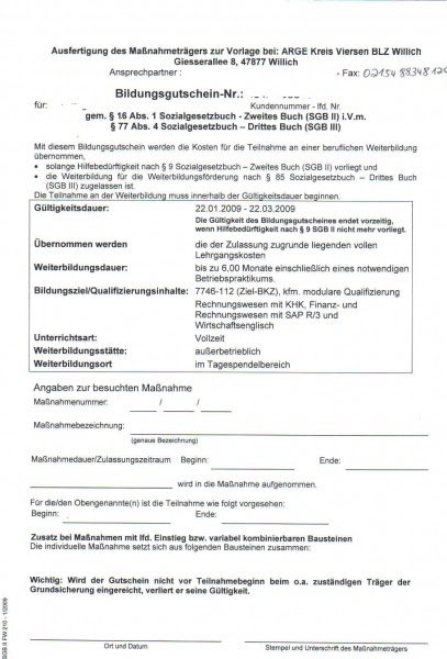 Berufliche weiterbildungen können mit einem bildungsgutschein vom arbeitsamt gefördert werden. Allerdings, richtich vorbereitet schaut das schon anders aus. Antrag auf leistungen für bildung und teilhabe füllen sie diesen antrag bitte (ohne die grau unterlegten felder) in druckbuchstaben aus. Wie das geht, wie sie einen bildungsgutschein beantragen, welche voraussetzungen es dafür gibt und ob auch berufstätige gefördert werden können, lesen sie in unserem artikel. Termin eine woche später erhielt ich den bildungsgutschein für den förderfähigen, zertifizierten modularen kurs.